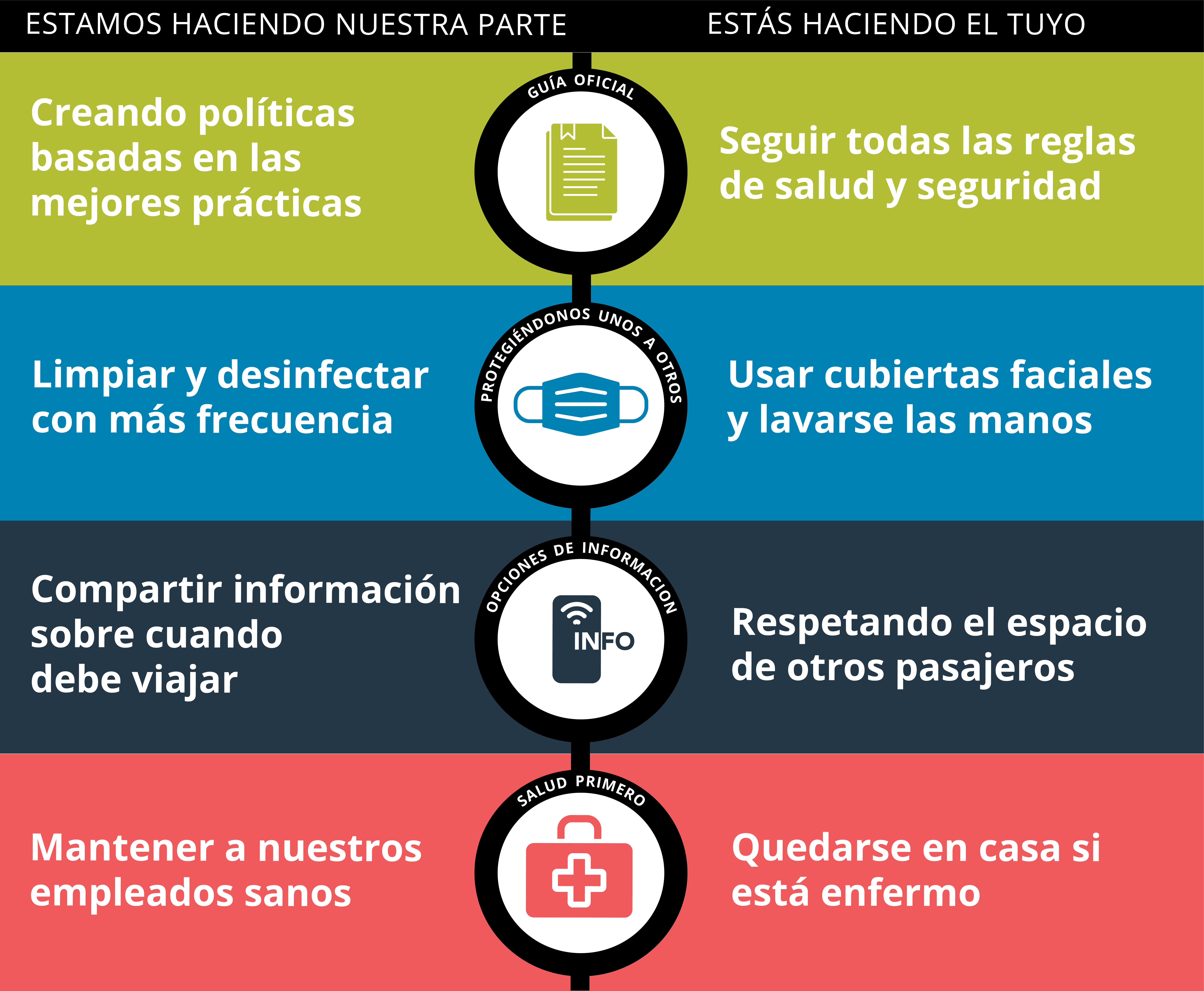 ¡Ya no! Los pasajeros deben abordar por la puerta principal en todos los autobuses. Hemos instalado barreras de plexiglás cerca de los choferes y la caja de tarifas para la protección de todos. El embarque en la puerta principal permite a los pasajeros pagar su tarifa en la caja de tarifas.