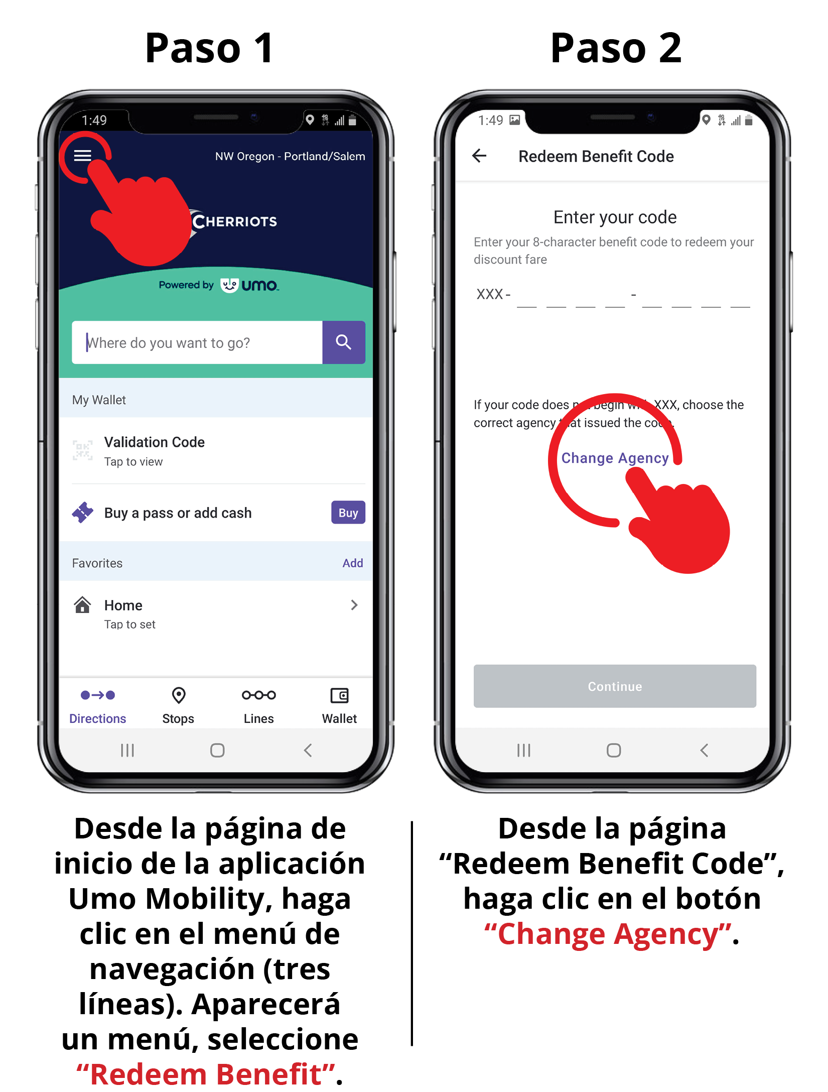 Descargue la aplicación de Umo Mobility en la tienda de aplicaciones de su teléfono inteligente y elija Cherriots como su proveedor de transporte. Luego, siga los pasos para crear una cuenta y comprar un pase o agregar fondos a la cuenta para futuros pagos de pasajes.