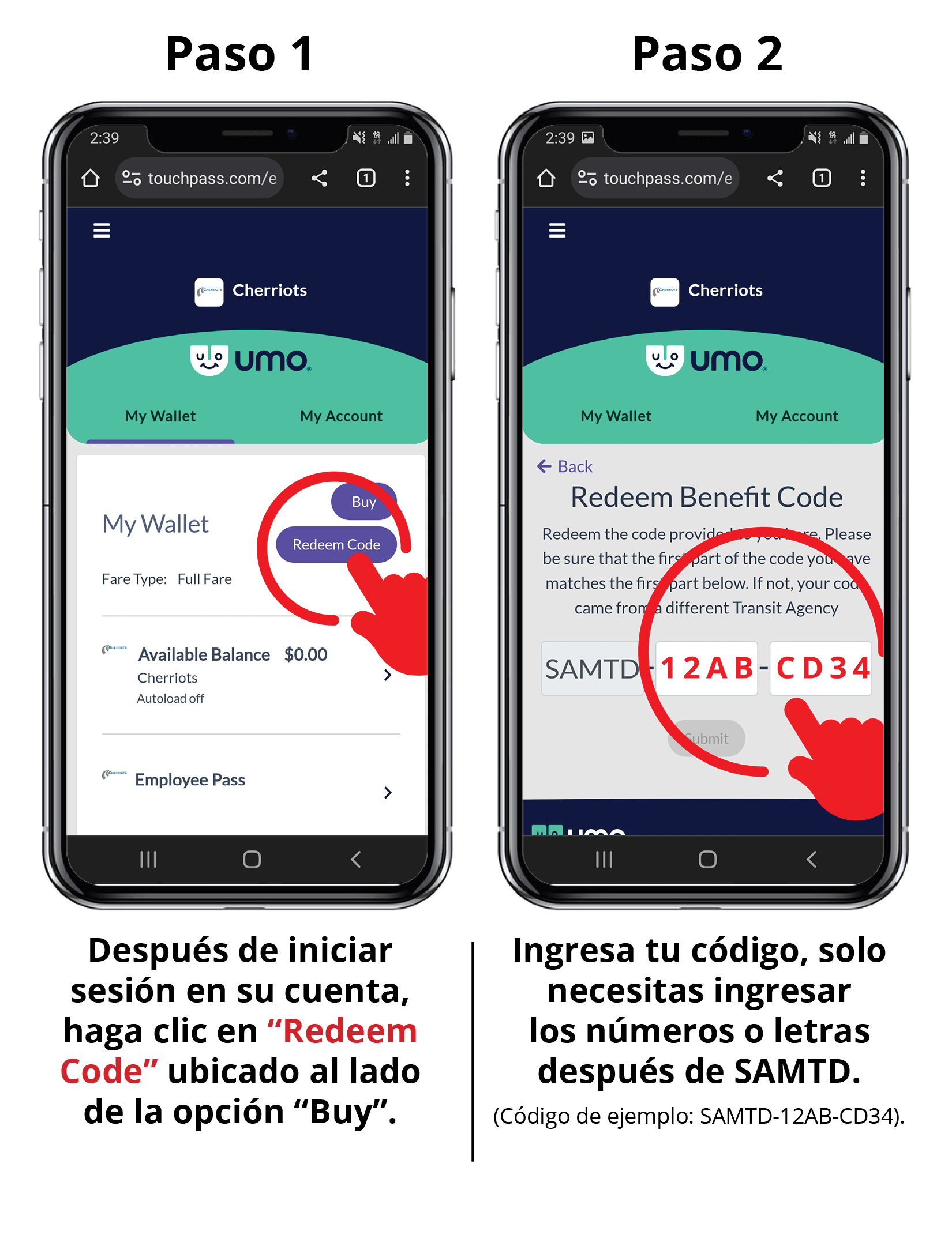 Para añadir fondos a su cuenta, los pasajeros pueden visitar UmoPass.com en línea, llamar al (503-588-2877) o visitar el Servicio al Cliente de Cherriots en 220 High St. NE. Recuerde que los pagos en efectivo deben hacerse en persona en el Servicio al Cliente de Cherriots.
